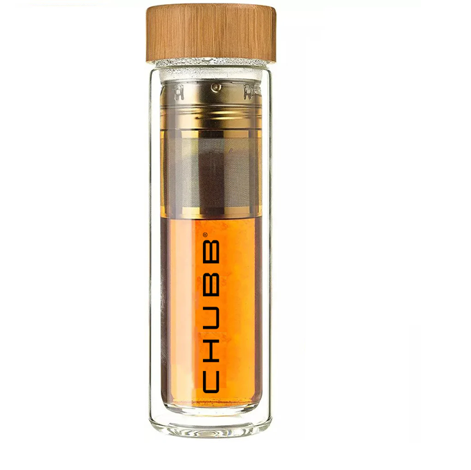 Elegant borosilicate glass travel bottle with bamboo lid, double wall insulation, and stainless steel tea filter.